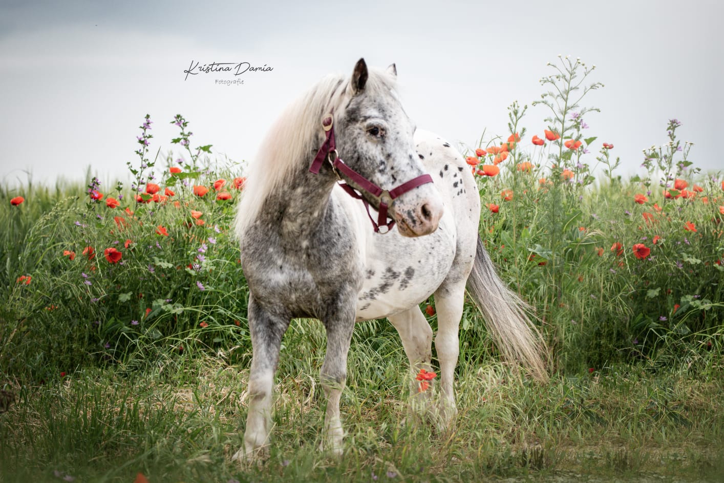 Unser kleines Tupfenpony Mara bezaubert die Kinder der Ponyschule mit ihrem Charme. Sie liebt es gebürstet und gekrault zu werden und ist geduldig mit den Kindern. Beim geführten Reiten in der Halle ist Mara sehr ruhig und anhänglich und somit auch für ganz junge Reiter sehr gut geeignet. Im Gelände entpuppt sie sich als flotter kleiner Flitzer, der mit den großen Pferden Schritt halten kann aber trotzdem immer kontrollierbar bleibt.